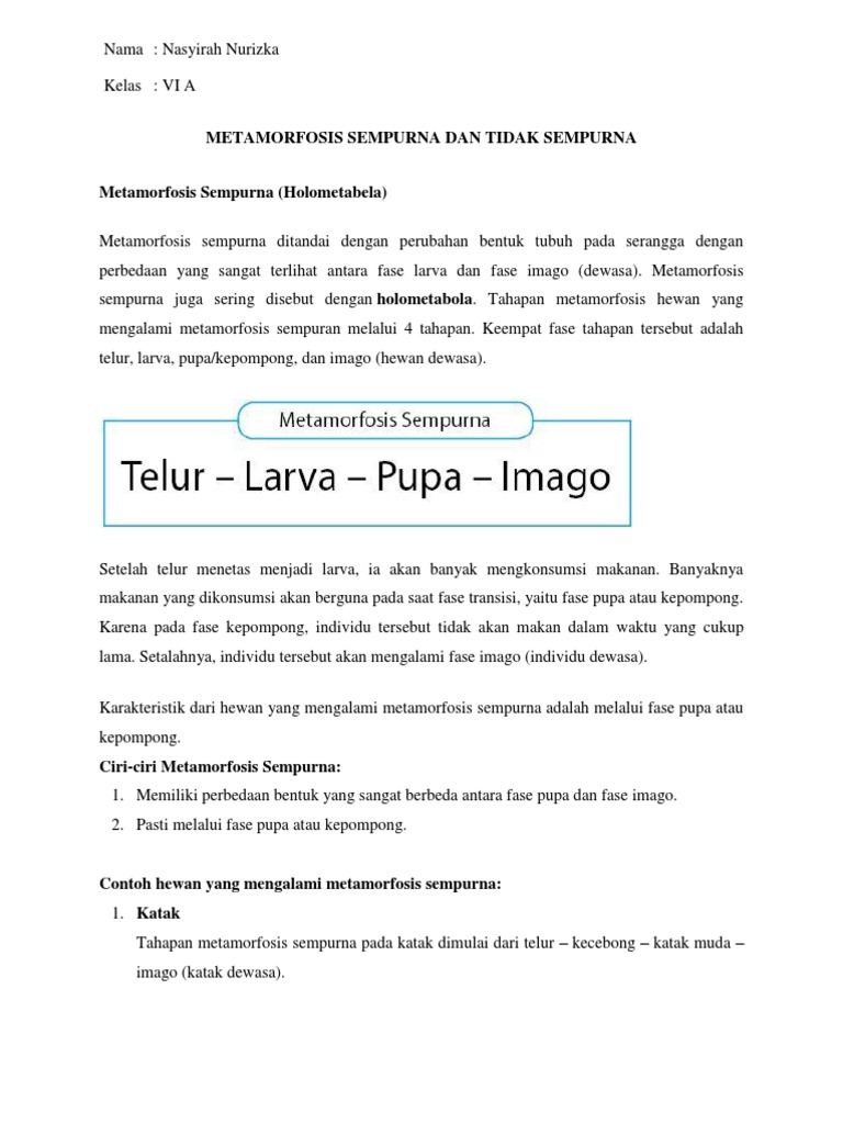 Metamorfosis sempurna tejadi pada jenis hewan yang termasuk amfibi ( katak ) dan sebagian jenis serangga. Hewan yang mengalami metamorfasis tidak sempurna bentuk hewan muda mirip dengan induknya, tetapi ada. Metamorfosis sempurna ditandai dengan perubahan bentuk tubuh pada serangga dengan. Umumnya, hewan dengan metamorfosis yang tidak sempurnalah yang tidak memiliki fase pupa. Metamorfosis sempurna ditandai dengan perubahan bentuk tubuh pada serangga dengan perbedaan yang sangat terlihat antara fase larva dan fase imago (dewasa). Metamorfosis tidak sempurna adalah metamorfosis yang melalui tahap telur yang menetas menjadi nimfa, kemudian tumbuh dan berkembang menjadi imago (dewasa). Metamorfosis sempurna dan tidak sempurna. Kelompok hewan dengan metamorfosis tidak sempurna ditandai dengan tidak mengalami fase pupa/kepompong. Metamorfosis tidak sempurna atau hemimetabola adalah proses pertumbuhan dan perkembangan pada hewan dengan hanya organ tertentu saja yang terjadi perubahan fisiologis. Fase imago metamorfosis tidak sempurna. Sedangkan pada metamorfosis tidak sempurna, hewan tidak mengalami fase pupa atau kepompong. Metamorfosis tidak sempurna melewati tiga tahapan yaitu telur, nimfa, dan dewasa. Metamorfosis tidak sempurna disebut juga dengan hemimetabola.